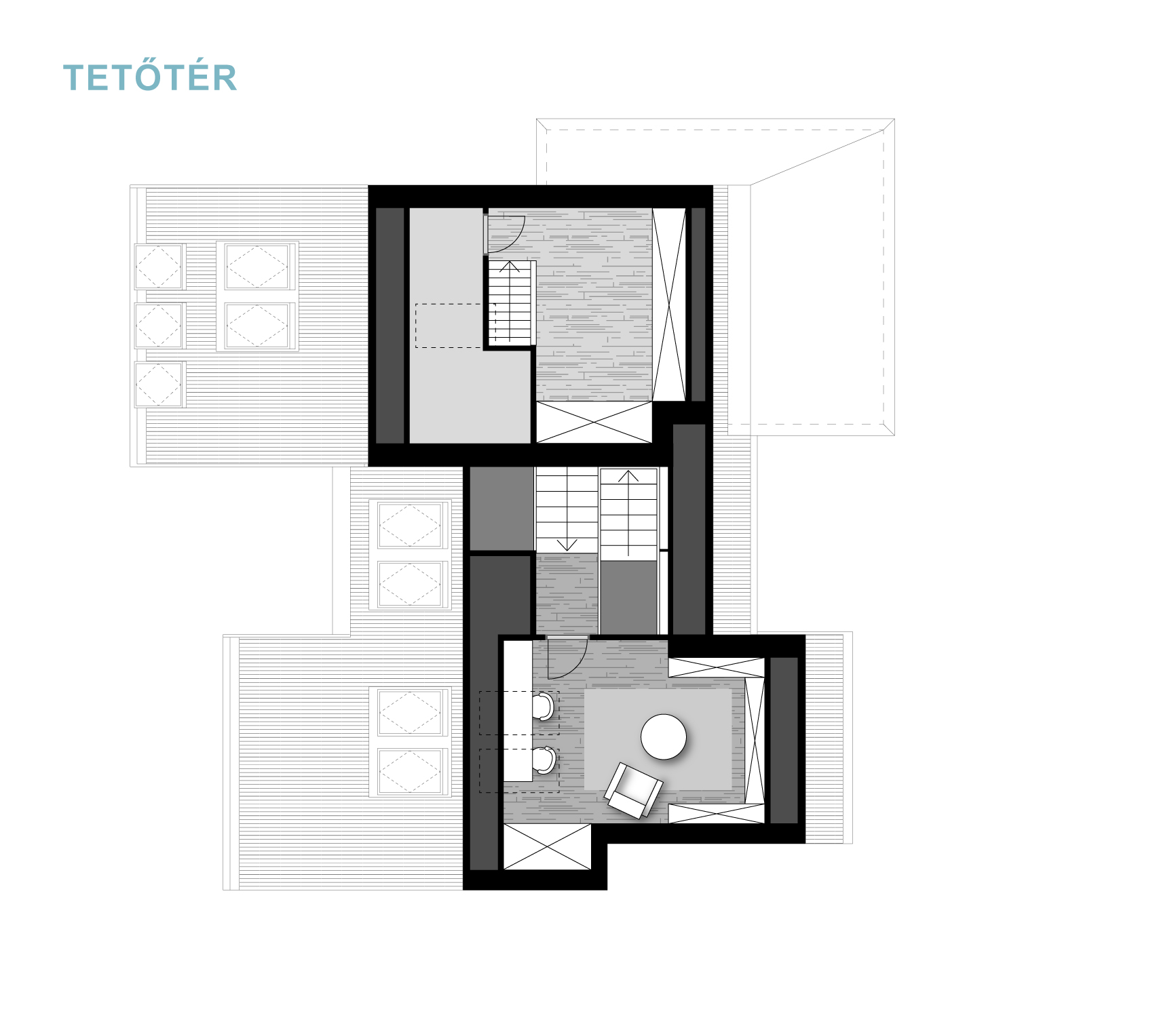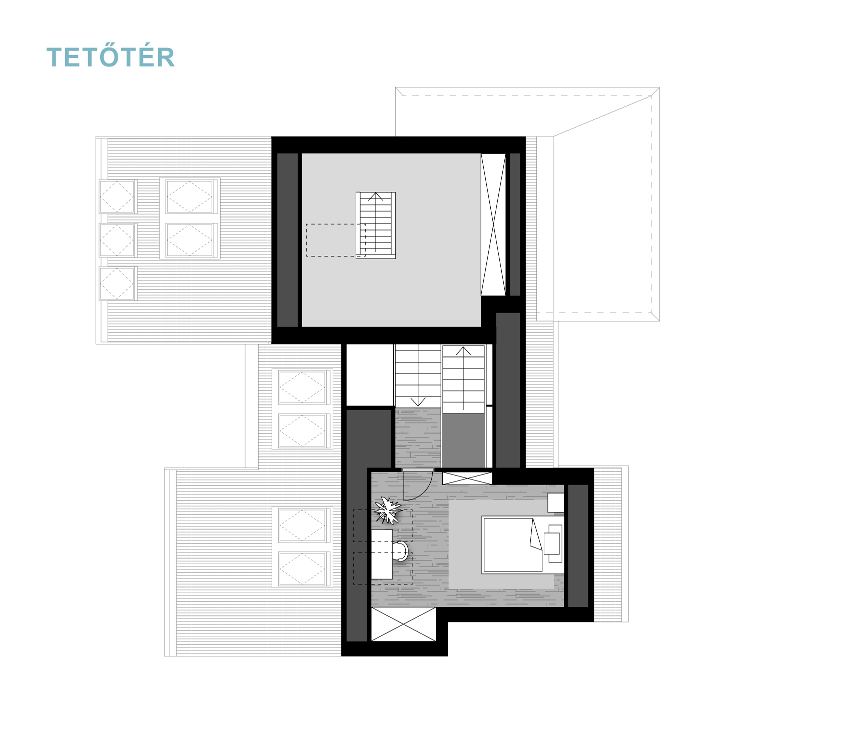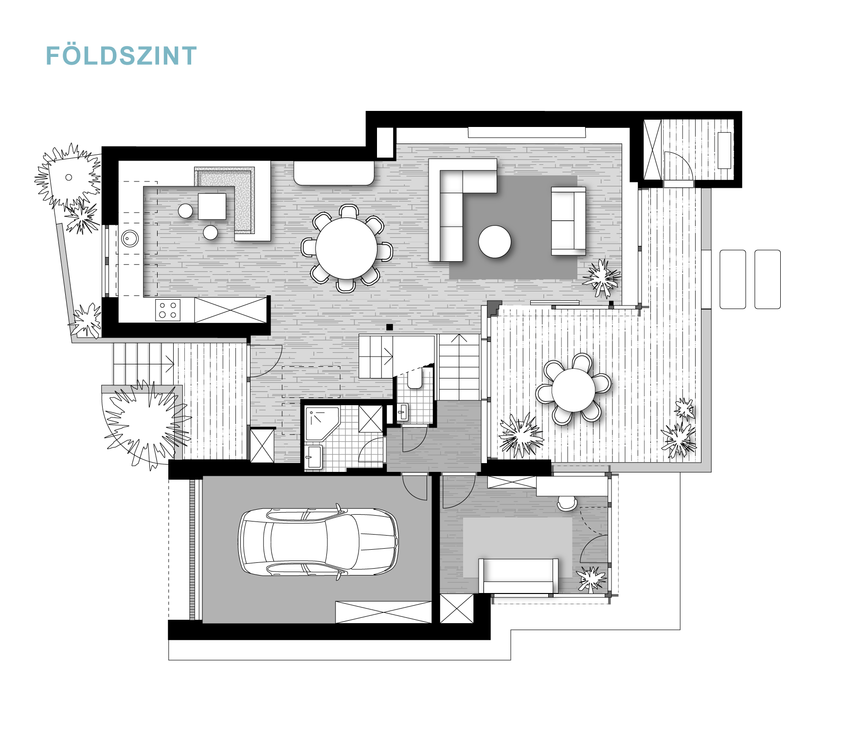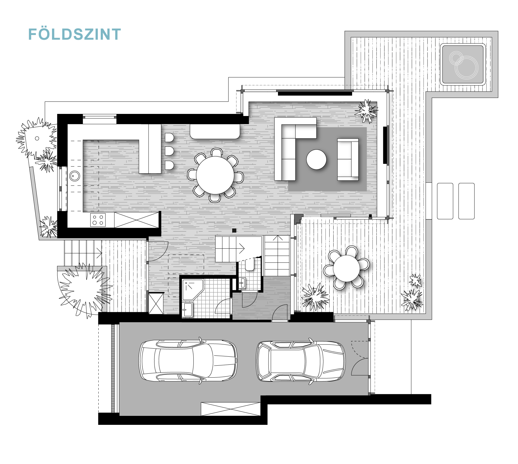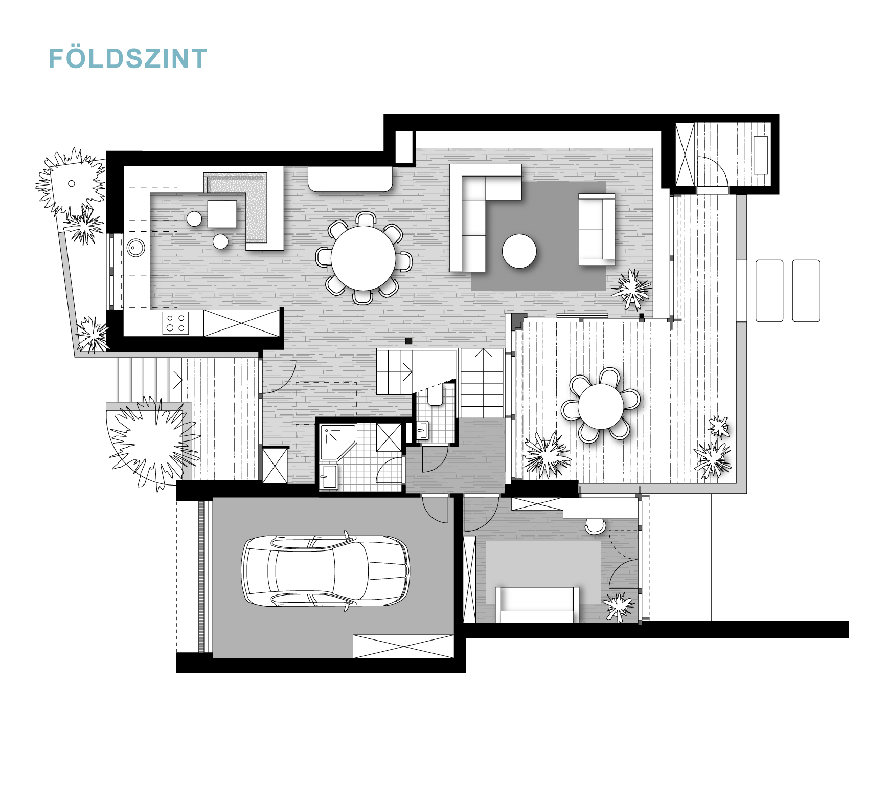A félszintes eltolásnak köszönhetően minden élettér privát szférája maximálisan biztosított, de mégis egybefűzött, jól értelmezhető.