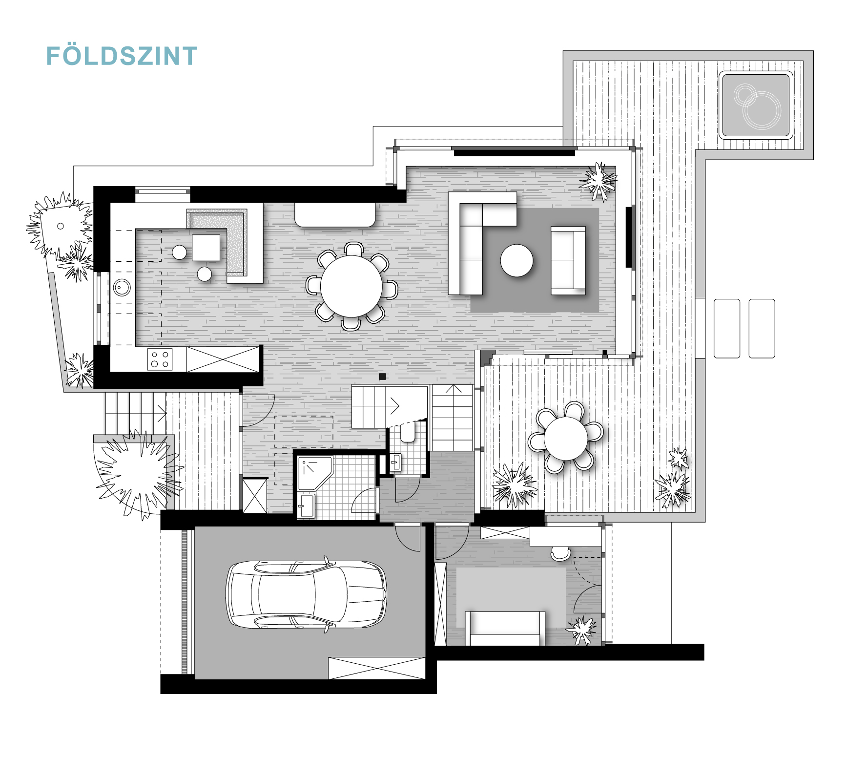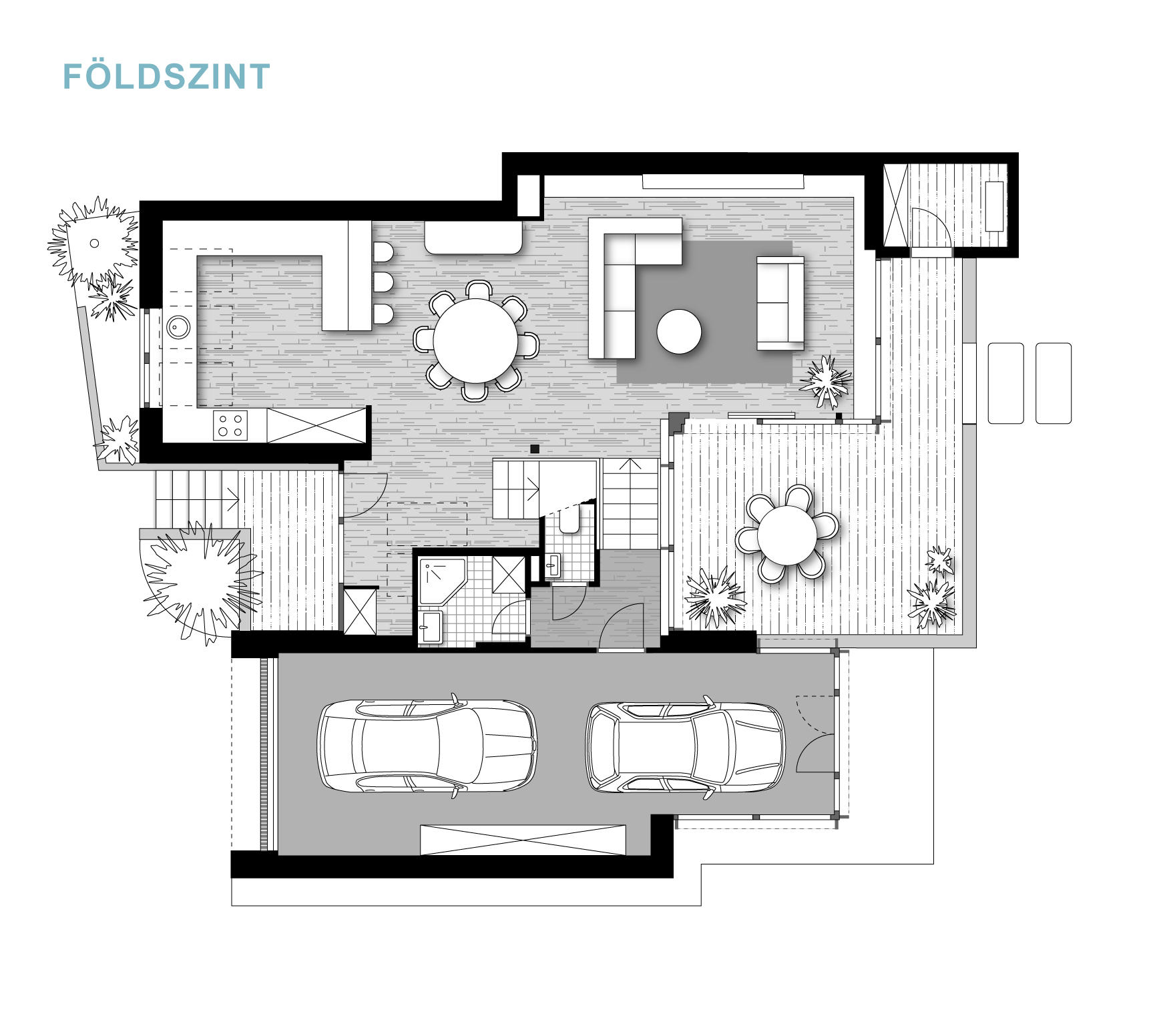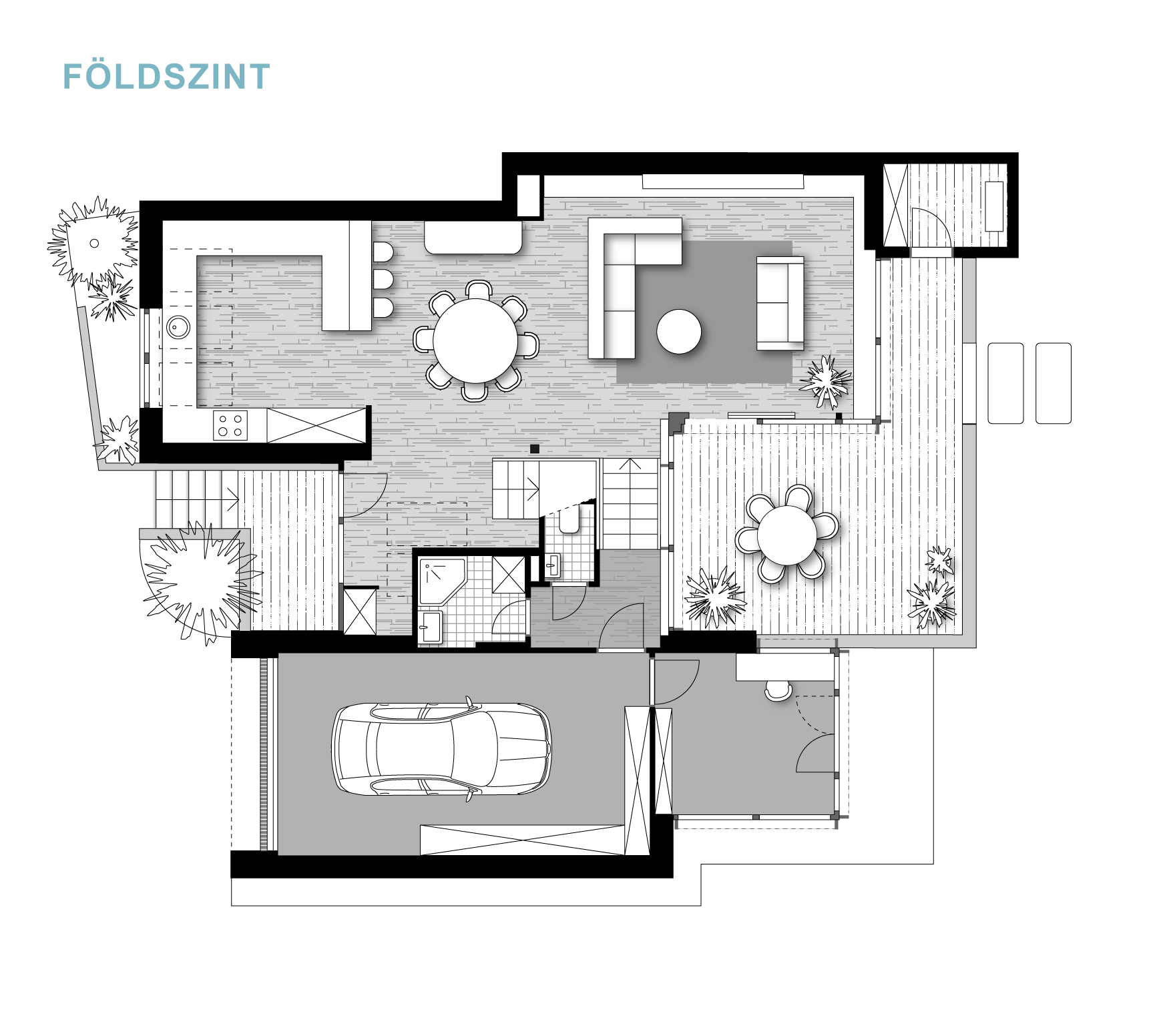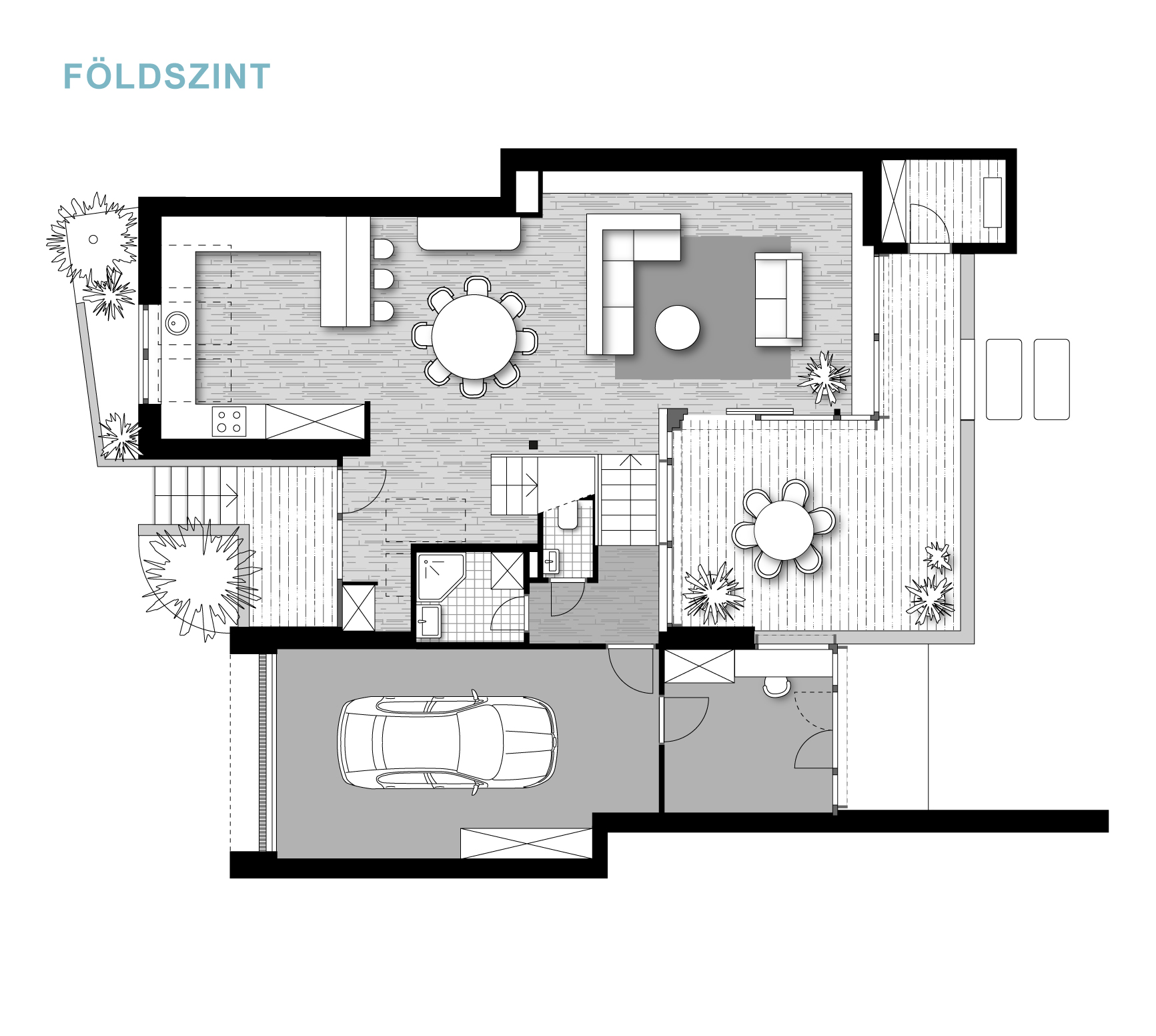 A félszintes eltolásnak köszönhetően minden élettér privát szférája maximálisan biztosított, de mégis egybefűzött, jól értelmezhető.