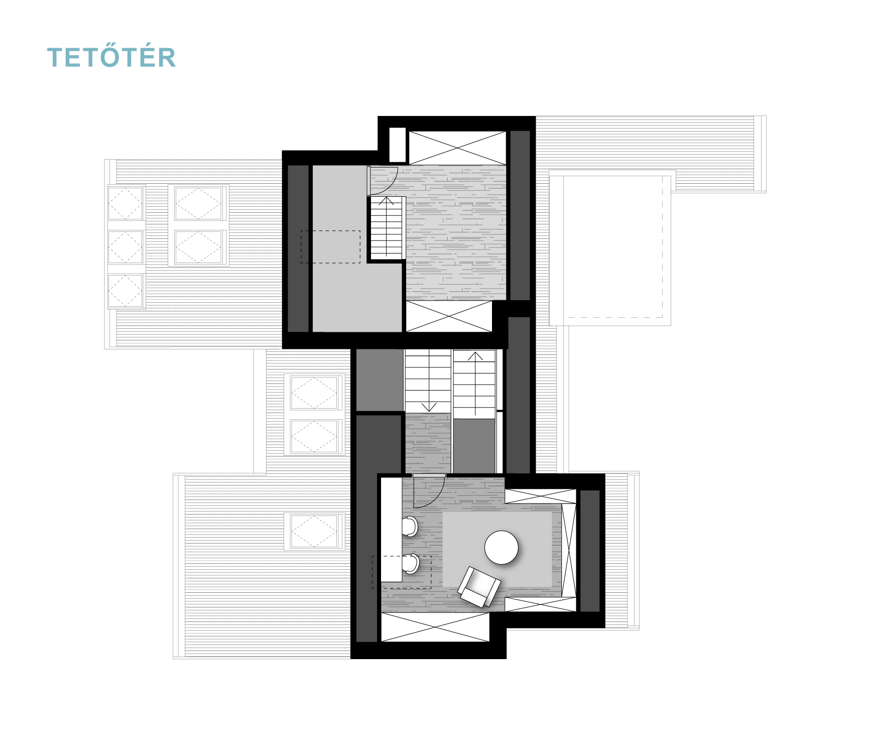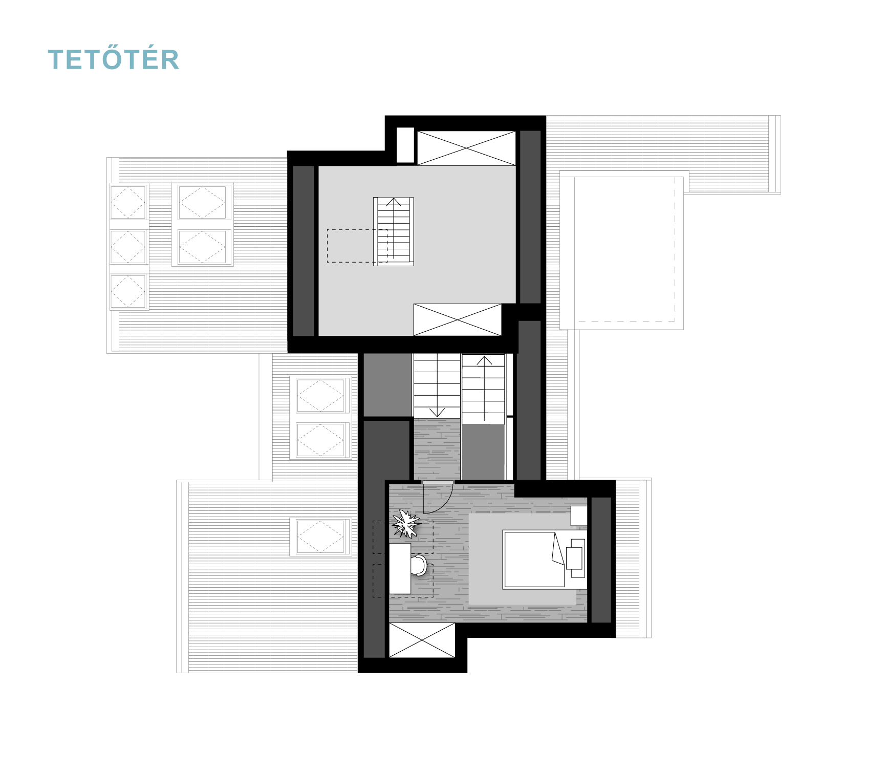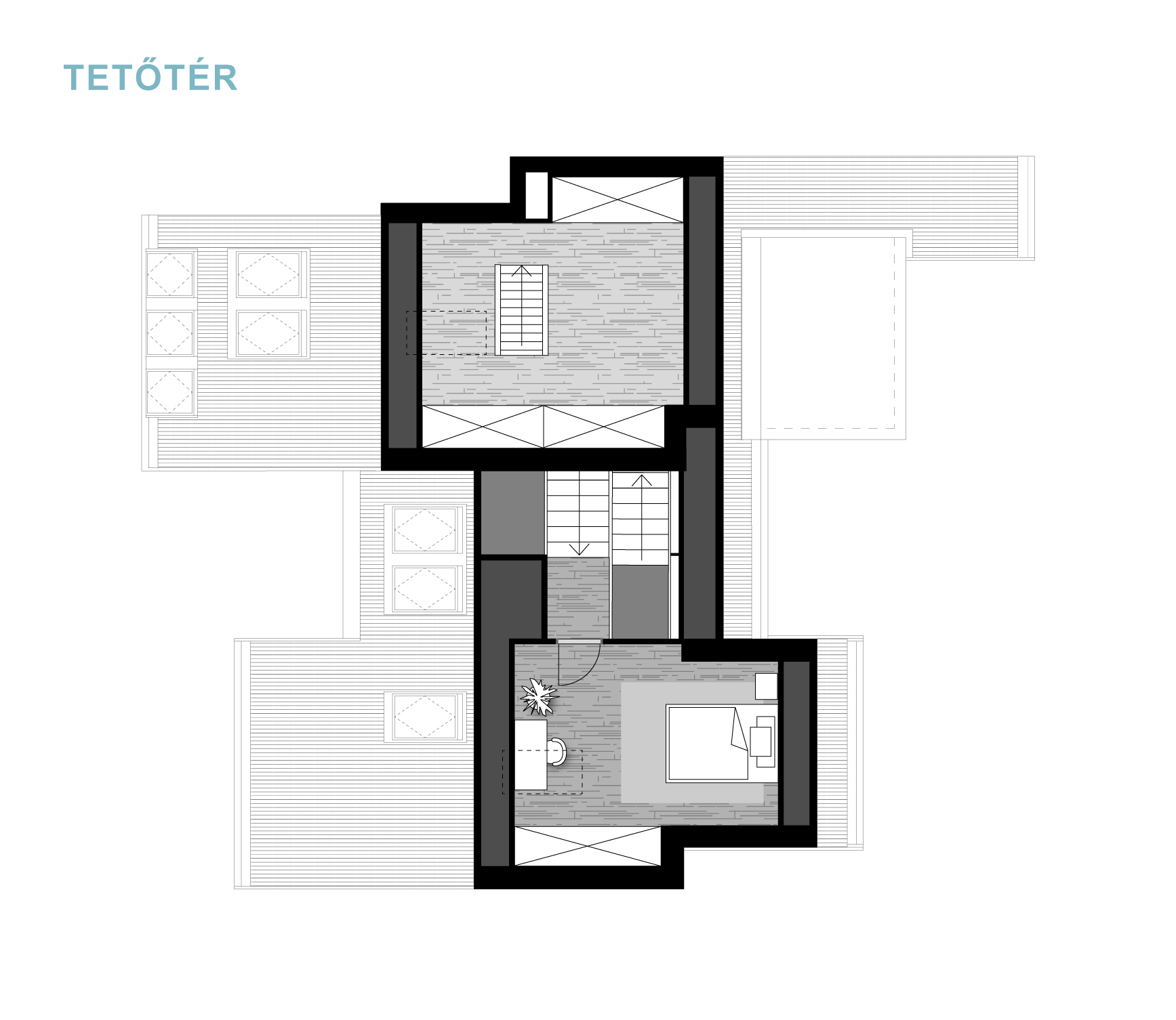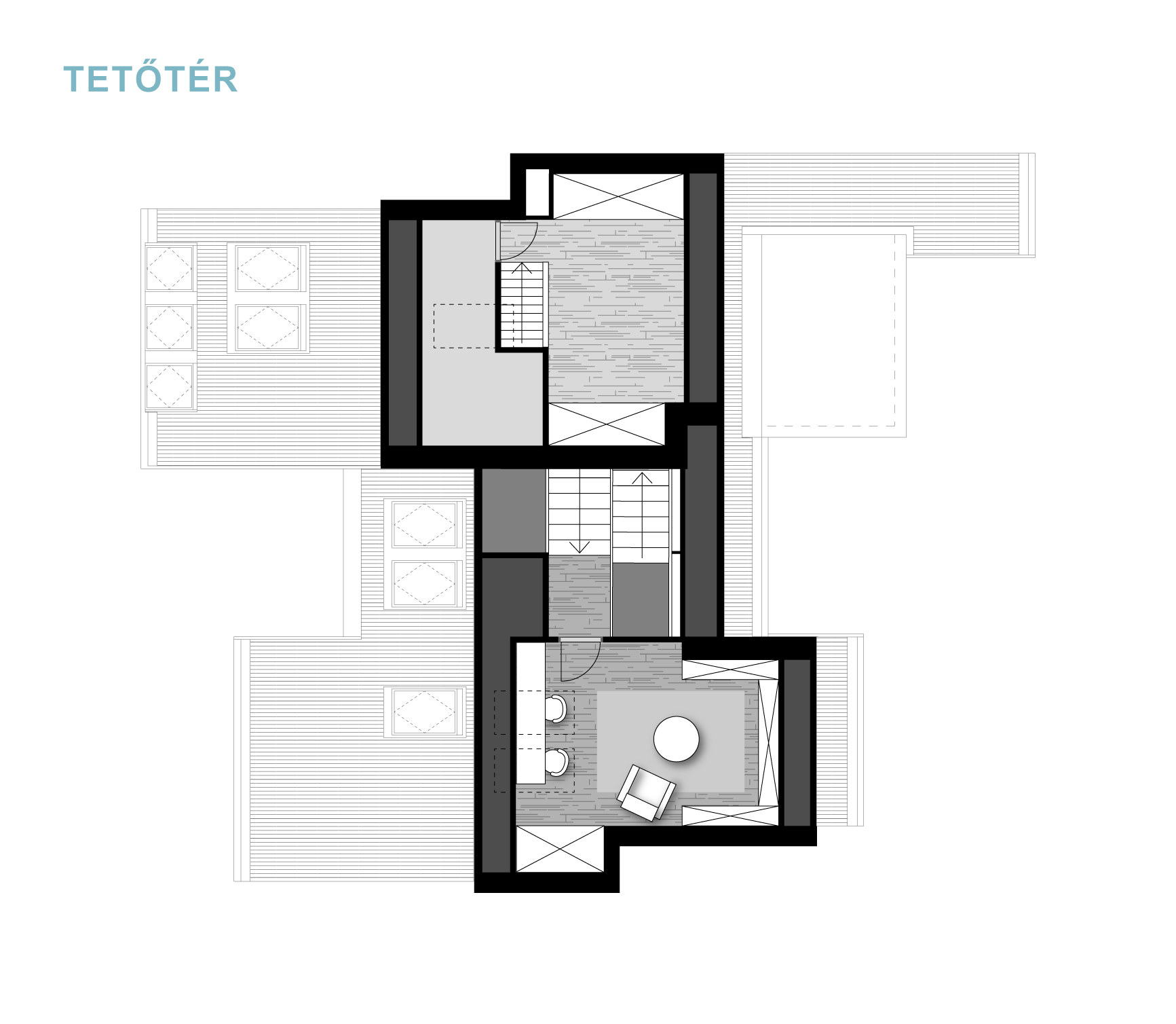 A félszintes eltolásnak köszönhetően minden élettér privát szférája maximálisan biztosított, de mégis egybefűzött, jól értelmezhető.